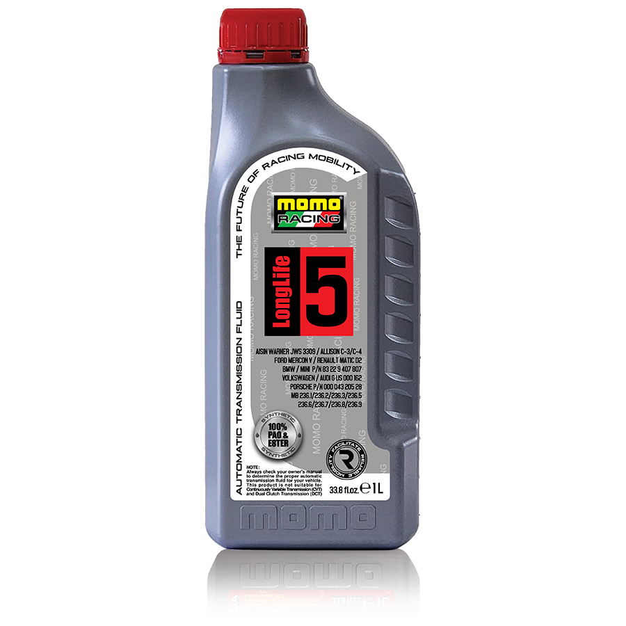 MOMO RACING ATF LONGLIFE 5 is a highly advanced, full synthetic, multi vehicle automatic transmission fluid. It is manufactured with advanced synthetic Group IV Poly Alpha Olefin (PAO) and Group V Alkylated Naphthalene (AN) with a special additive and inhibition, which guarantee a perfect function of the latest additive technology for applications in many modern types of universal automatic transmission fluid for ZF automatic transmission (4HP and 5HP). The latest multi-vehicle automatic transmission fluid technology that is suitable for most manufacturer requirements such as Allison C-4, Mercon® V, JASO 1-A, JWS 3309 and many others. The full synthetic formulation has improved oxidation stability, shear stability and friction durability to enhance transmission shift performance. ATF LONGLIFE 5 is particularly suitable for long drain use in 4 and 5 + speed automatic transmissions in passenger cars, 4WD’ and light commercial vehicles. ATF Multi-Vehicle suitable for use in BMW, Mercedes-Benz, Audi, Volkswagen, Porsche, Land Rover, Jaguar, Volvo, Renault, Maserati, Lotus, Peugeot, Citroen, Chevrolet, Ford vehicles including applications where high viscosity fluids are required.