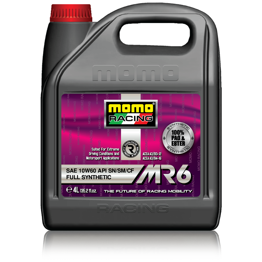 Advanced Group IV Poly Alpha Olefin (PAO) – Advanced Group V Alkylated Naphthalene (AN) MOMO RACING Full Synthetic 10W-60 Racing Oil is recommended for use in multi-cam, multi-valve, turbocharged, supercharged and large bore naturally aspirated high-performance race engines under high-stress race conditions. Group IV Poly Alpha Olefin (PAO) and Group V Alkylated Naphthalene (AN) base oils provide fast flowing shear stable protection from cold start-up to high operating race temperatures. MOMO RACING Full Synthetic 10W-60 Racing Oil provides enhanced protection for vehicles using E85 and other highperformance fuels. MOMO RACING Full Synthetic 10W-60 Racing Oil contains Molybdenum Dithiocarbamate, which is scientifically proven to dramatically reduce friction, provide increased protection against engine wear and maximise engine power.